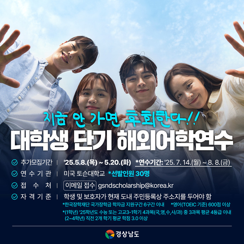 도는 지난 해에 이어 올해도 도내 대학생 30명을 선발해 여름방학 기간 단기 해외 어학연수 프로그램을 지원한다. 이번 연수는 도와 자매결연을 맺은 메릴랜드 주 토슨대학교에서 7월 13일부터 4주간 이루어진다. 참가희망자는 오는 20일까지 이메일 (gsndscholarship@korea.kr)로 신청서를 제출하면 된다.