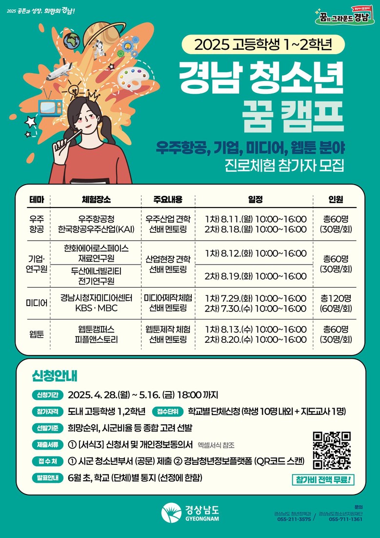올해는 특히 학생들의 관심이 높은 테마를 편성하고 선배와의 현장 멘토링도 진행하는 등 선호를 반영해 프로그램을 개선했다. 꿈 캠프는 오는 16일까지 경남청년정보플랫폼(https://youth.gyeongnam.go.kr/youth/)이나 시군 청소년부서로 신청할 수 있다.