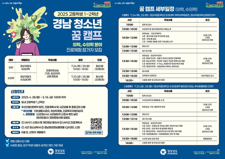 도는 7~8월 방학기간 도내 고등학생 400명을 대상으로는 ‘경남 청소년 꿈 캠프’도 개최한다. 꿈 캠프는 지난해 참가자 88%가 만족한다고 답하여 학생 호응이 높은 사업으로, 올해는 의학, 수의학 등 심화전공탐색 분야와 우주항공, 방산 등 경남주력 산업 분야, 6개 테마로 총 12회 진행한다.