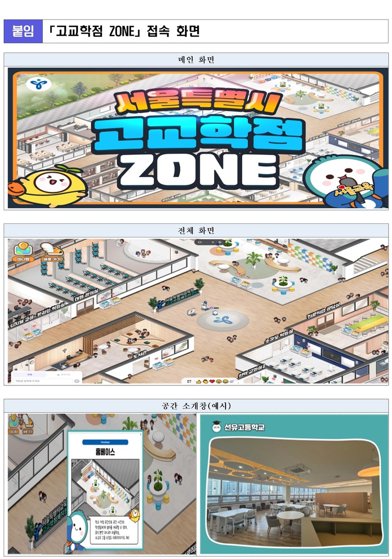 [서울 세계타임즈=이장성 기자] 서울특별시교육청(교육감 정근식)은 12월 17일(수), 고교학점제 학교 공간을 소개하는 가상 공간 플랫폼(ZEP) 기반 「고교학점 ZONE」을 고교학점제지원센터 홈페이지(https://seoulhsc.sen.go.kr)에 개통한다.