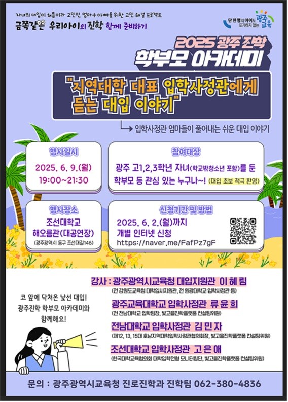 강사로는 전국 최초 입학사정관 출신 이혜림 시교육청 대입지원관, 광주교육대 류윤희, 전남대 김민자, 조선대 고은애 입학사정관 등이 참여한다.
