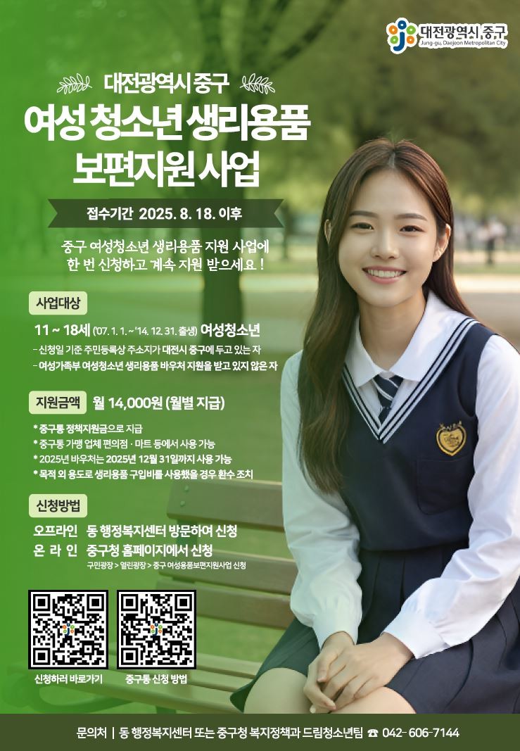 - 한 번 신청으로 연말까지 지원, 온라인 및 동 행정복지센터에서 접수 - [중구 세계타임즈=이채봉 기자] 대전 중구(구청장 김제선)는 대전 자치구 중 최초로 여성 청소년의 건강권 보장을 위해 도입한 ‘2025년 중구 여성청소년 생리용품 보편지원 사업’신청을 18일부터 받는다.