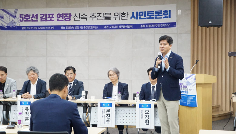유정훈 아주대학교 교통시스템공학과 교수가 ‘5호선 김포 연장 과제와 교통망 개선 방안’을 주제로 발제했고, 좌장인 이기형 경기도의원이 좌장인 이기형 경기도의원을 중심으로 문진수 교통연구원 철도산업·광역철도연구팀장, 오강현·배강민 김포시의회 더불어민주당 시의원, 남동경 경기도 철도항만물류국 국장, 기획재정부와 국토교통부 정부 담당자 등 6명의 패널이 토론을 진행했다.