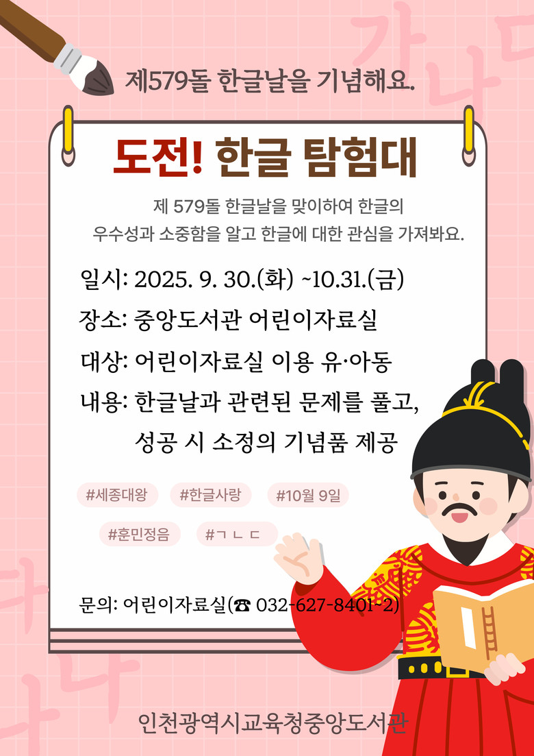 이번 행사는 어린이자료실에서 진행하며, 어린이들이 비치된 문제지를 풀며 한글의 독창성과 우수성을 체험할 수 있도록 준비했다.