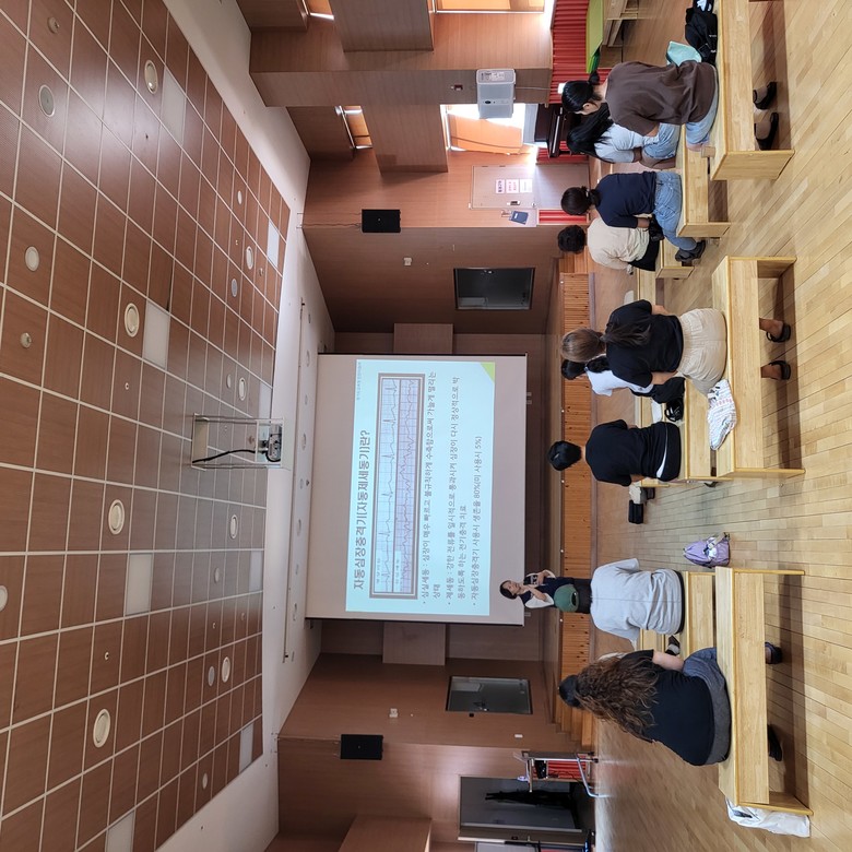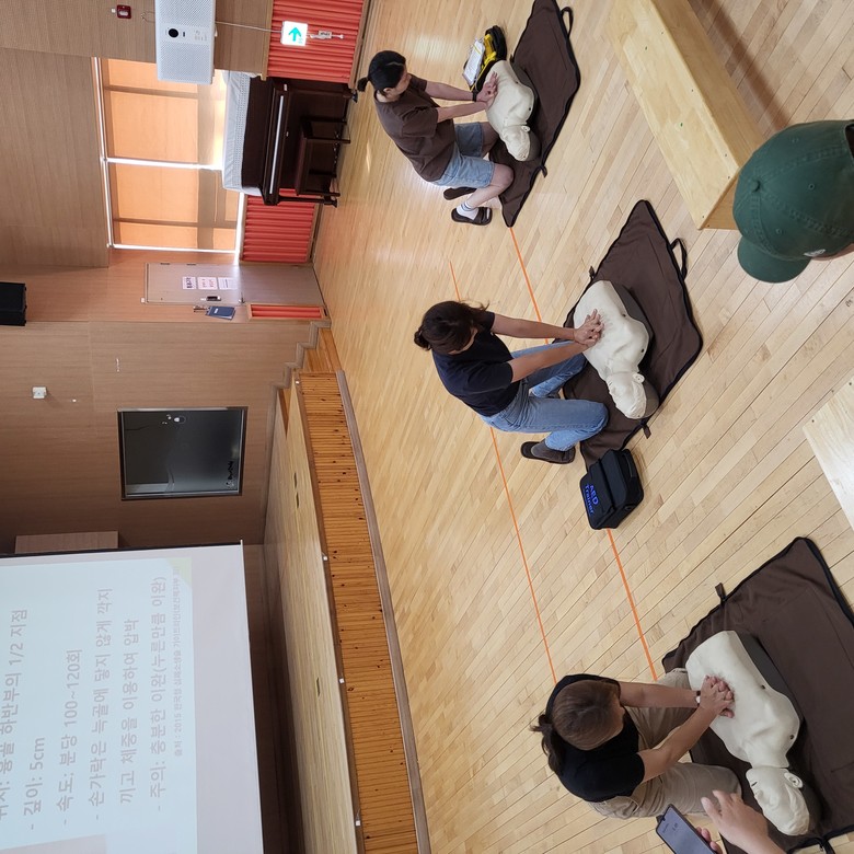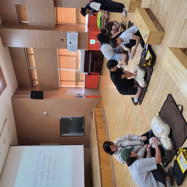 원활한 안전교육을 실습하기 위해 넓은 3층 강당에서 교육이 이루어졌다. 먼저 안전에 대한 이론 교육으로 시작한 후, 심폐소생술을 직접 체험할 수 있도록 애니모형과 교육용 자동심장충격기를 활용한 교육이 이어졌다.
