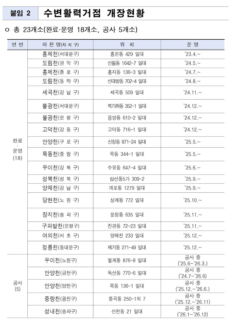 2025년까지 총 18개소의 수변활력거점 조성을 완료하여 운영 중이며 올해는 ▲우이천(노원구) ▲안양천(양천구) ▲안양천(금천구) ▲중랑천(광진구) ▲성내천(송파구) 등 5개소를 추가로 조성하여, 연말까지 서울 전역에 총 23개소의 수변활력거점을 완성할 계획이다. 신규 거점에는 실내 분수(우이천), 수상레저 시설(안양천), 북카페 및 전망대(중랑천) 등 지역 특화 시설이 대거 도입된다.