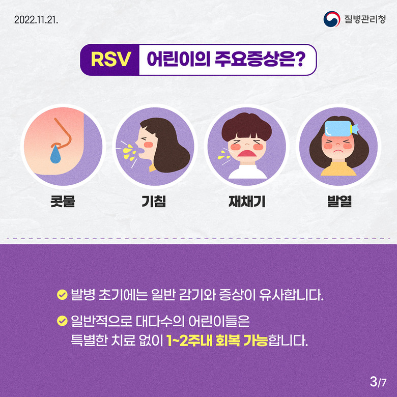 급성호흡기감염병인 호흡기세포융합바이러스(Respiratory Syncytial Virus, RSV)는 제4급 법정감염병으로 매년 10월부터 이듬해 3월까지 주로 발생한다.