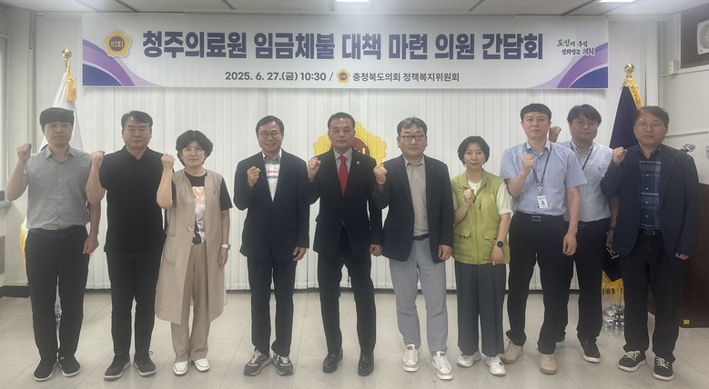 [충북 세계타임즈=이현진 기자] 충북도의회 정책복지위원회는 27일 박지헌 의원(청주4) 주최로 도의회 7층 회의실에서 ‘청주의료원 임금체불 대책 마련 의원 간담회’를 개최했다.