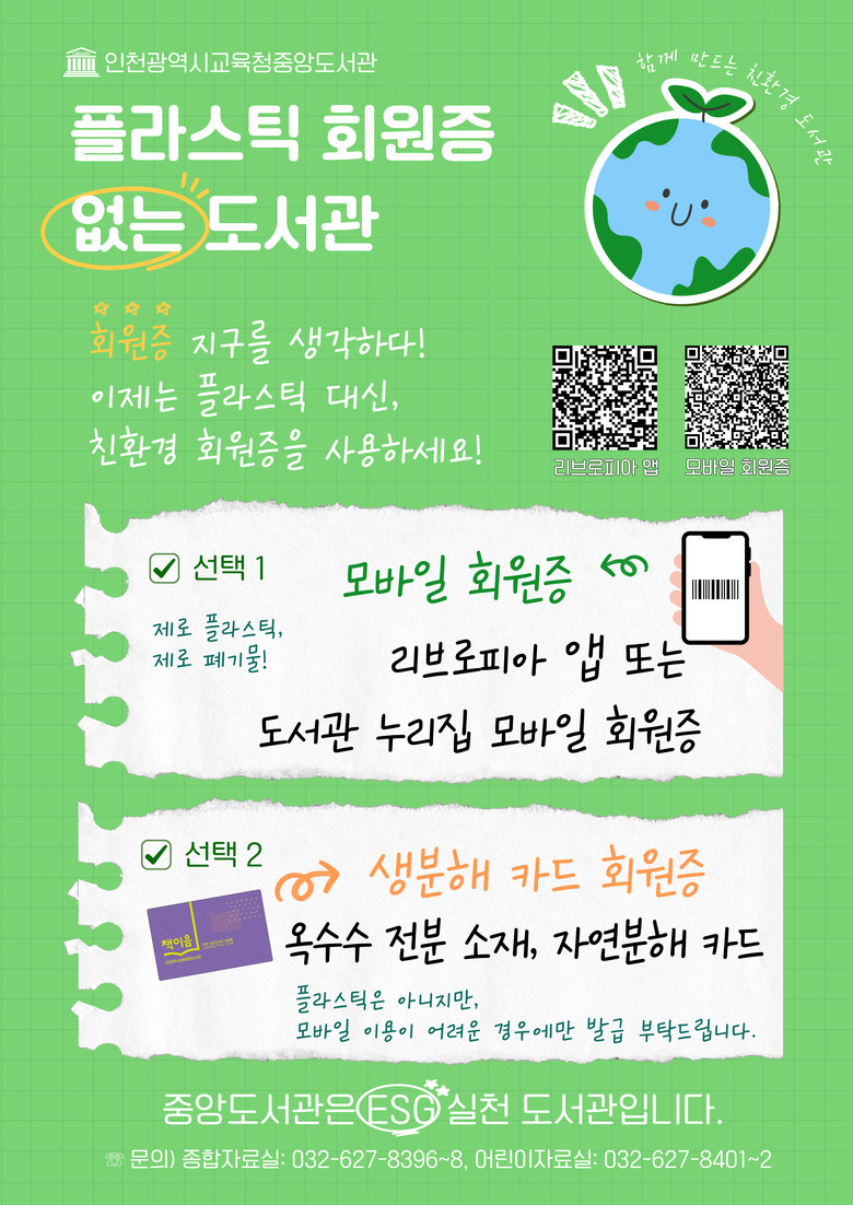 특히 중앙도서관은 가장 친환경적인 방식인 모바일 회원증 사용을 적극 권장하고 있으며, 모바일 기기 사용이 어려운 이용자에게는 옥수수 전분으로 만든 생분해 카드를 제공한다.