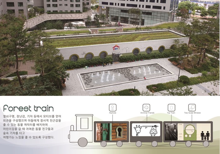 어린이집 정면에 즐거운 놀이터가 될 바닥분수대를 설치했으며, 이를 둘러싸고 아이들의 눈높이에 맞춰 심어진 작은 나무들이 오솔길처럼 펼쳐져 숲 속을 모험하는 이미지를 친환경적으로 구현했다. 또한 다양한 핸드 드로잉 동물 일러스트와 동물을 주제로 한 놀이터 등을 배치해 어린이집에 갈 때 귀여운 동물들과 꿈꾸는 기차를 타고 여행을 가는 느낌을 줄 수 있도록 했다.