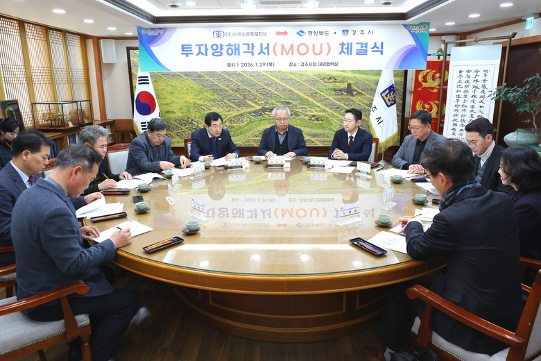 이날 협약식에는 경상북도 이남억 공항투자본부장, 경주시장, 경주시의원, ㈜티에스오토모티브 민규현 대표 등 20명이 참석해 투자계획을 공유하고 상호 협력 의지를 다졌다.