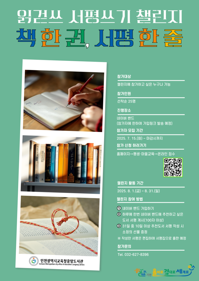이번 챌린지는 인천 시민 누구나 참여할 수 있으며, 참여 신청은 7월 15일부터 중앙도서관 누리집(https://lib.ice.go.kr/jungang/index.do)에서 가능하다.