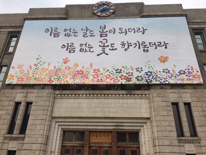 서울도서관 '이름 없는 날도 봄이 되어라 이름 없는 꽃도 향기롭더라'내걸어...