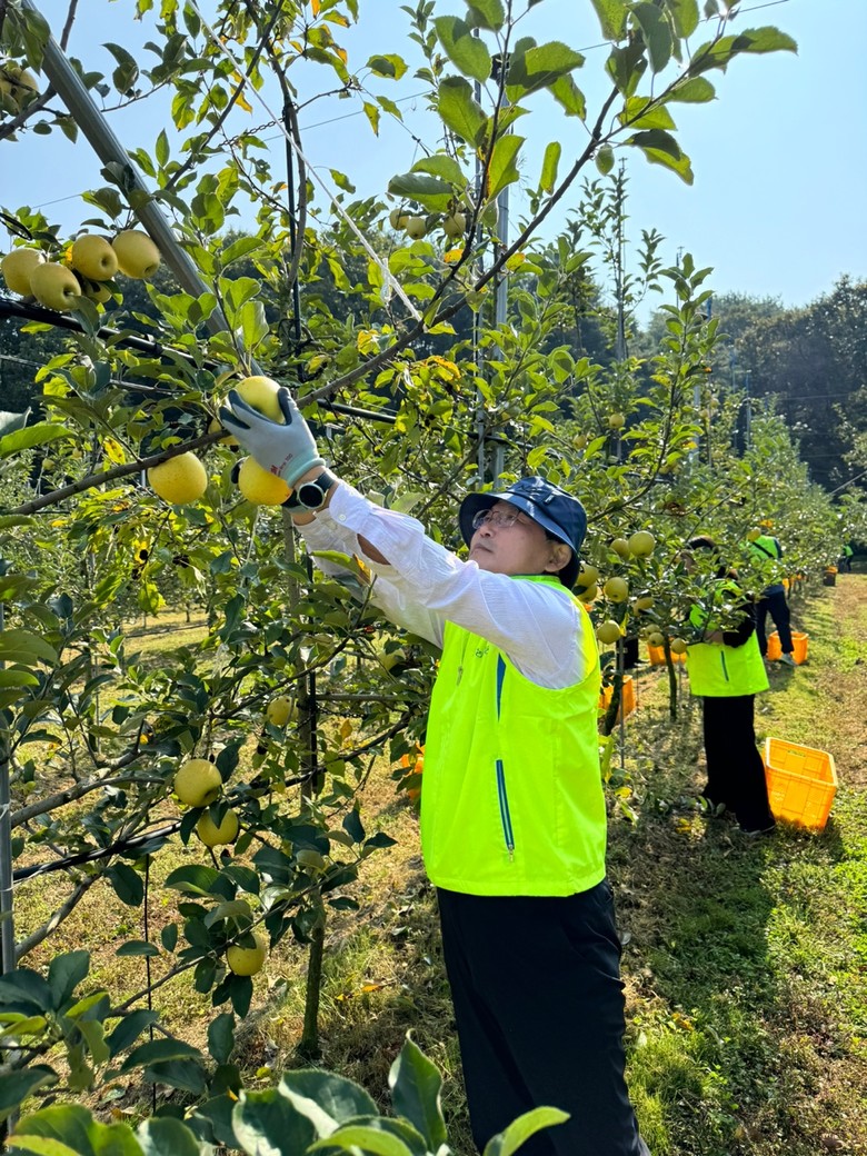 농협은행 임직원들은 사과 수확과 부사 잎 제거, 토사물 정리 등 과수농사 마무리 작업에 힘쓰며 일손부족을 호소하는 농가에 힘을 보탰다.