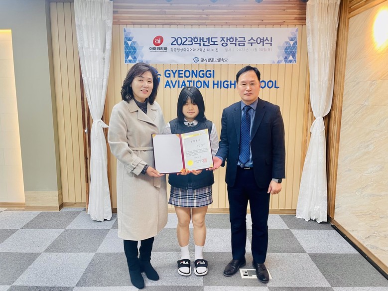 [광명시 세계타임즈=송민수 기자] 2023년 11월 30일, 경기항공고등학교(교장 유형진, 이하 ‘경기항공고’)에서 열린 ‘사단법인 아이코리아 장학금 수여식’에서 아이코리아 회장이면서 경기도 여성단체 협의회 광명지회 회장, 광명시 놀탄(놀면서 탄소중립) 운영위원장이기도 한 김지영 회장이 경기항공고 2학년 최세진 학생에게 200만원의 장학금을 수여했다.