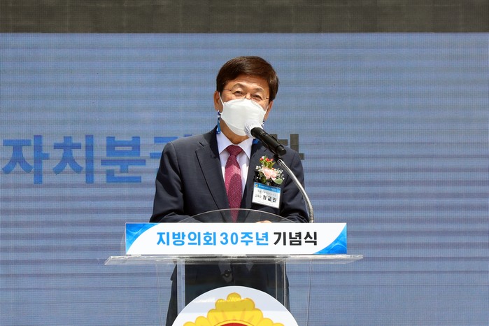▲ 강준현 국회의원이 지방의회 30주년 축사를 하고 있다.