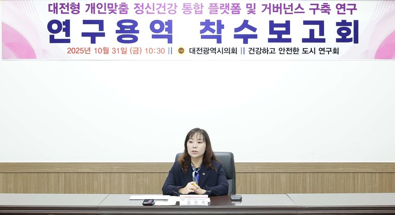 [대전 세계타임즈=이채봉 기자] 대전시의회 ‘건강하고 안전한 도시연구회(회장 김민숙의원)’는 31일 시의회 공감실에서 ‘대전형 개인맞춤 정신건강 통합 플랫폼 및 거버넌스 구축’ 연구 용역 착수 보고회를 개최했다.