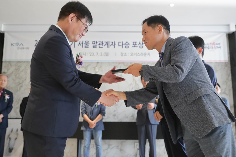 [세계타임즈 = 송민수 기자] 한국마사회(회장 정기환)는 지난 7월 2일 렛츠런파크 서울 오너스 라운지에서 ‘2023년 상반기 다승달성 말관계자 포상 및 은퇴·개업 행사’를 개최했다고 밝혔다. 올해 눈부신 활약으로 다승기록을 달성한 마주와 조교사, 은퇴와 개업을 앞둔 조교사와 기수들이 관계자들과 팬들의 박수갈채를 받았다.