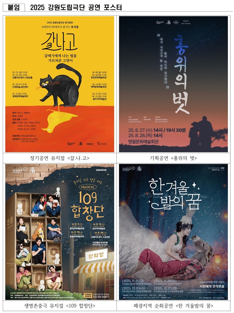 합평회에서는 정기공연 뮤지컬 <갈매기에게 나는 법을 가르쳐준 고양이>, 기획공연 <홍위의 벗>, 생명존중극 뮤지컬 <109 합창단>, 폐광지역 순회공연 <한 겨울밤의 꿈> 등 주요 작품의 추진 성과가 공유됐다. 올해 강원도립극단은 도내·외 15개 지역에서 4개 작품, 26회 공연을 진행했으며, 전체 관람만족도를 90% 달성하는 등 도민의 문화예술 향유 확대에 기여했다는 평가를 받았다.