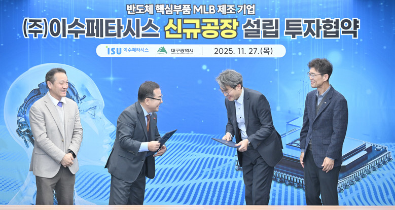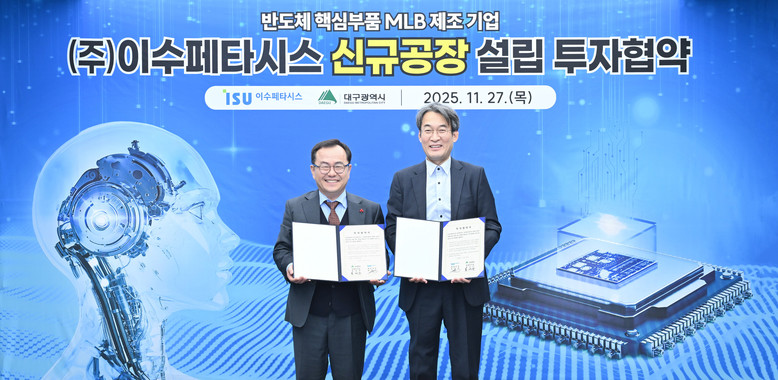 [세계타임즈=대구 한윤석 기자] 대구광역시는 11월 27일(목), 시청 산격청사에서 ㈜이수페타시스(대표 최창복)와 503억 원 규모의 투자협약을 체결했다. 이번 협약에 따라 고다층 인쇄회로기판(MLB*) 생산을 위한 드릴공정 신규공장이 달성2차산업단지에 설립된다.