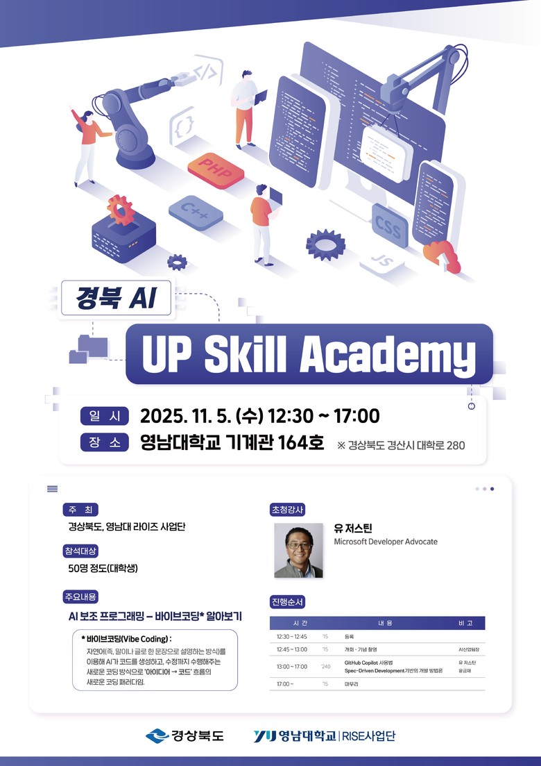 이번 특강은 경상북도와 영남대학교 라이즈(RISE) 사업단이 공동 주최한 행사로, 영남대 학생 50여 명이 참석한 가운데 인공지능(AI) 기반 개발 실무 역량 강화와 미래 기술 흐름 체험의 장으로 성황리에 진행됐다.