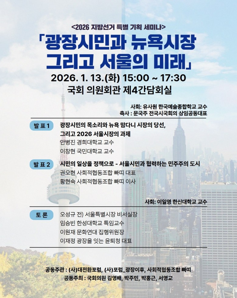 이번 세미나는 뉴욕시장 선거에서 드러난 도시정치의 변화와 광장시민의 요구를 바탕으로, 서울을 ‘참여 기반 정책도시’로 전환하기 위한 과제와 시민협력플랫폼 구상을 논의하는 자리다.