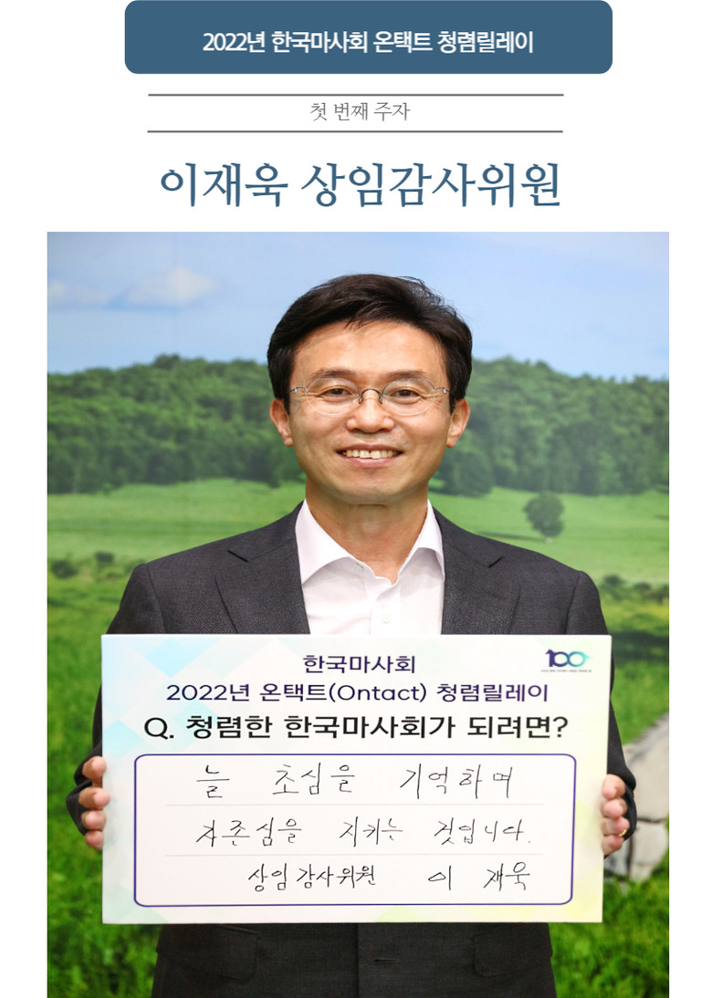 청렴릴레이는 반부패 청렴문화를 확산하고 임직원들의 공감대를 형상하기 위한 활동이다. ‘청렴한 한국마사회가 되려면?’ 물음에 본인의 생각을 공유하는 청렴릴레이는 상임감사위원을 시작으로 24명의 고위직 및 외부위원들이 순차적으로 참여해 7월 21일부터 약 40일간 이어진다. 각기 다른 24명의 메시지는 사내게시판을 통해 온택트 방식으로 전 임직원에게 공유된다.