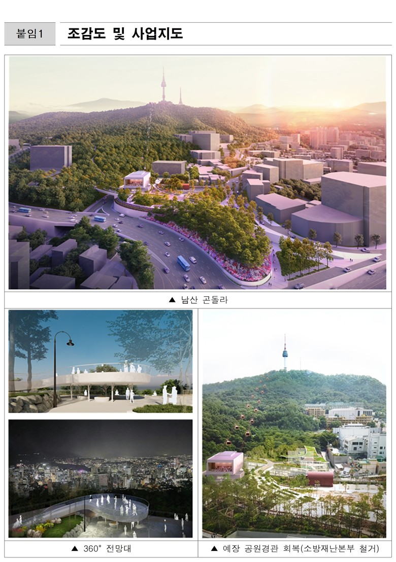 - '27년 명동역~남산 정상까지 5분 ‘남산 곤돌라’‧정상부 ‘360° 전망대’‧조망거점 조성