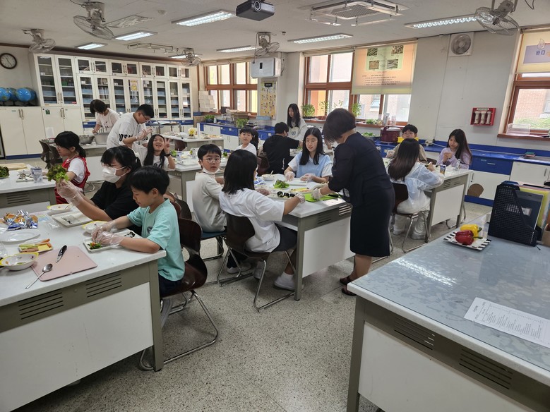 특히 6학년 수업은 6월 4일(화)부터 매일 한반씩 7일간 진행이 되는데, 수업 전날 교장선생님께서 직접 신선한 재료를 구입하고 저녁에 자택에서 손수 재료를 손질하였다. 아침마다 담임선생님과 함께 수업 준비를 하며, 학생들과 건강하고 맛있는 음식을 함께 만들기 위해 노력하고 있다.