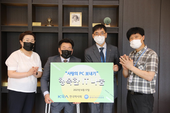[세계타임즈 심하린 기자]한국마사회(회장 김우남)가 미활용 IT기기를 장애인, 저소득가정 등 사회취약계층을 위해 무상 기증했다. 마사회는 지난17일 ‘사랑의 PC나눔’기증식을 열고 데스크톱PC 674대를 포함한 IT기기 총 951대를 ‘한국IT복지진흥원’과 ‘한국장애인IT고용협회’에 전달했다.