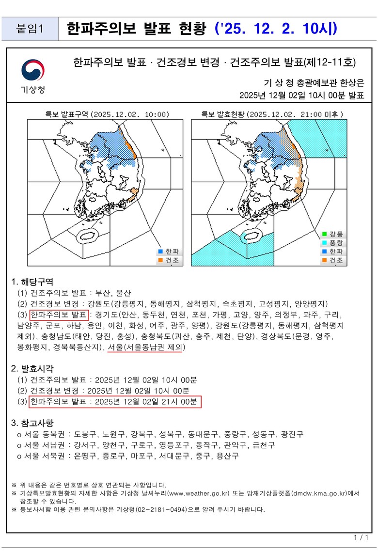 한파주의보가 발효된 지역은 서울 동북권(도봉구‧노원구‧강북구‧성북구‧동대문구‧중랑구‧성동구‧광진구), 서북권(은평구‧종로구‧마포구‧서대문구‧중구‧용산구), 서남권(강서구‧양천구‧구로구‧영등포구‧동작구‧관악구‧금천구) 총 21개 자치구에 해당한다.