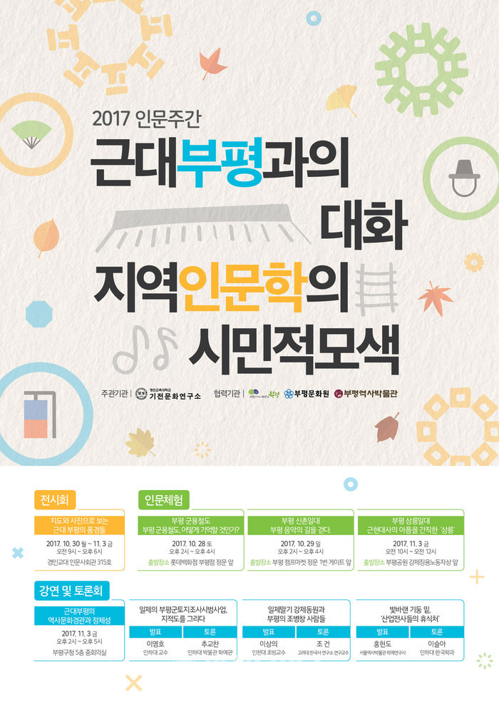 경인교대 기전문화연구소 전종한 소장은 “2017 인문주간 행사 주제를 ‘근대부평과의 대화-지역인문학의 시민적 모색’으로 정한 것은 근대이행기의 역사적 주요 현장으로서 부평 지역의 의미를 지역민들과 함께 되새기고 나눔으로써 진전된 지역인문학을 모색하고 나아가 미래부평의 모습을 이야기하기 위한 것”이라고 밝혔다.