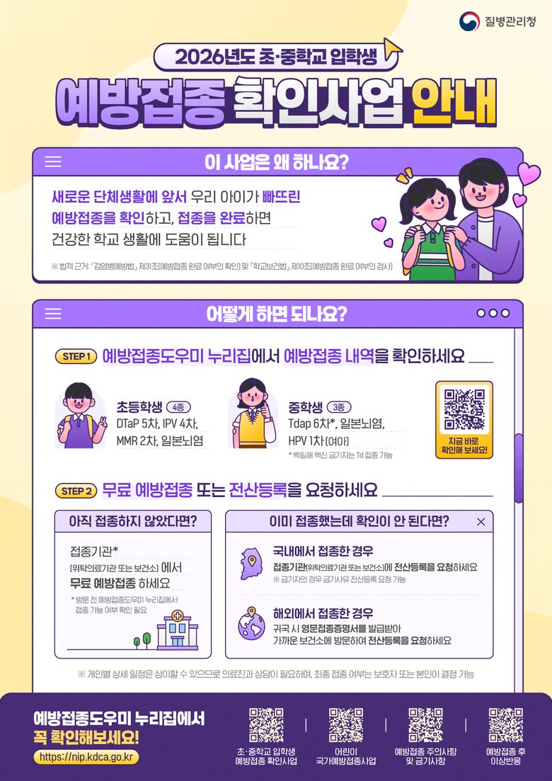 학교는 나이스(NEIS) 시스템을 통해 예방접종 여부를 확인하고 관련 자료를 취합해 보건소에 제출하며, 보건소는 이를 바탕으로 접종 완료 현황을 관리하고 미접종자에게 접종을 안내할 예정이다.
