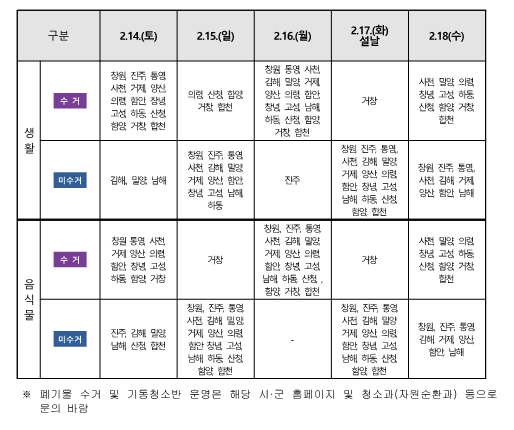 경남 설 연휴 기간 중 폐기물 수거일정(안)