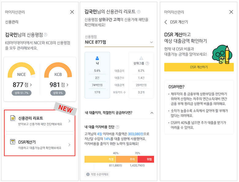 KB마이데이터 서비스는 여러 기관에 흩어진 자신의 거래정보를 KB스타뱅킹으로 모아 한눈에 분석·관리할 수 있는 맞춤형 자산관리 서비스다. 신설된 ‘신용관리 리포트’· ‘DSR 계산기’서비스도 KB마이데이터 가입 후 KB스타뱅킹에서 이용가능하다.