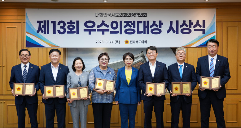 우수의정대상은 대한민국시도의회의장협의회가 전국의 시ㆍ도의원 가운데 능동적이고 선제적인 의정활동으로 지역발전에 크게 기여한 의원을 선정, 수여하는 상으로 올해로 13회를 맞이했으며, 국주영은 전라북도의회 의장(전주12)이 상패를 전수했다.