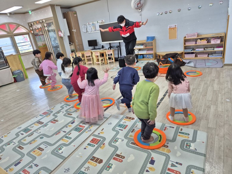 건강체조교실은 유아체육 전문 강사를 활용한 신체활동 프로그램으로, 다양한 움직임 놀이를 통해 기초체력을 기르고 또래 친구들과의 관계 형성을 돕는다. 놀이 중심 활동으로 진행돼 아이들이 자연스럽게 신체활동의 즐거움을 느끼며 적극적으로 참여하고 있다.