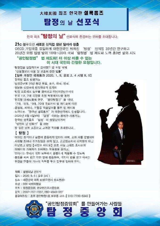 이어 “8월 5일 시행되는 탐정법 발의로 한국판 셜록홈즈의 탄생이 가능해졌다”며 “그래서 이날(8월 5일)을 탐정의 날이자 탐정들의 생일로 선포하기 위해 이번 행사를 개최하게 됐다”고 강조했다.