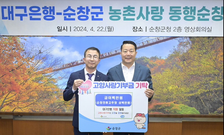 아울러 협약과 함께 DGB대구은행은 고향사랑기부제의 성공적인 정착과 지역 경제 활성화를 위해 고향사랑기부금 200만원을 기탁했다. 이어 고추장민속마을을 방문해 300만원 상당의 순창전통고추장도 구입하며 순창군을 응원하고 호남사랑의 선제적 실천으로 순창 사랑의 첫 걸음을 시작했다.