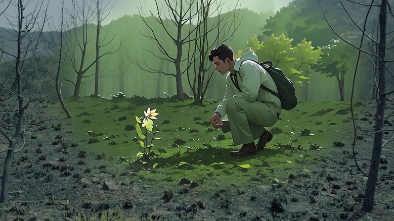 영상은 불에 그을린 숲 속에서 희망의 꽃을 발견하는 장면으로 마무리되며 조용하지만 깊은 위로와 회복의 메시지를 전한다.