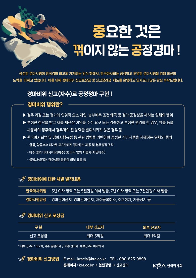 - 한국마사회, 경마비위 신고포상금 및 장려금제도 통해 국민 누구나 공정한 경마문화 기여 가능