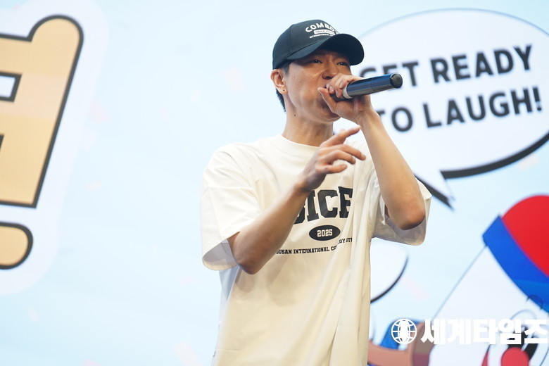 가수 배치기'탁'이 1일 서울 마포구 상암 스탠포드 호텔에서 진행된 제13회 '부산국제코미디페스티벌' 기자간담회에 참석해 축하공연을 하고있다.