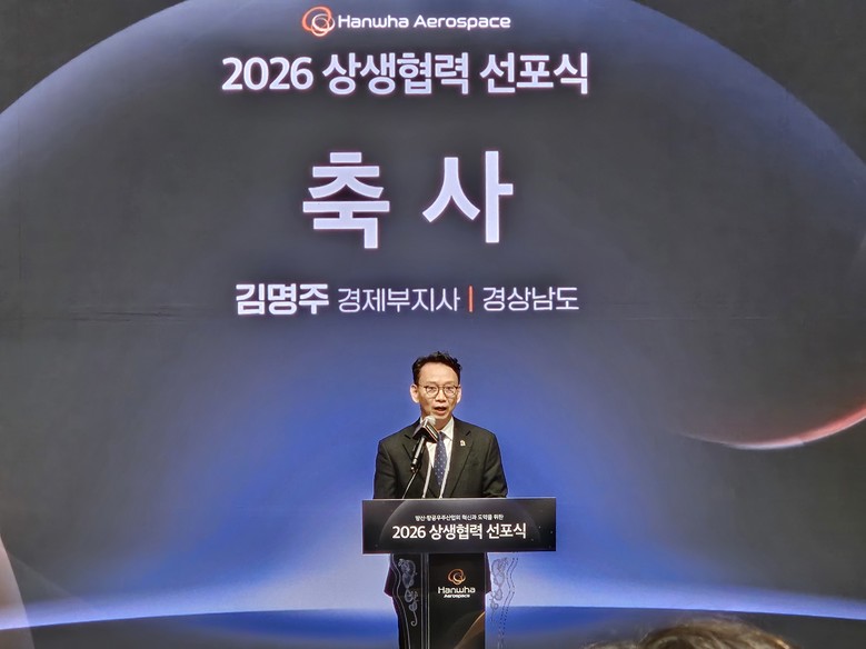 - 방산 상생협력 거점 ‘경남’, 민·관 협력으로 글로벌 경쟁력 강화 [세계타임즈=경남 최성룡 기자] 경상남도는 3일 오후 한화에어로스페이스 창원3사업장 R&D센터에서 열린 ‘한화에어로스페이스 2026 상생협력 선포식’에 참석해 방위산업 분야 대·중소기업 상생협력 확산을 위한 민·관 협력 의지를 재확인했다.