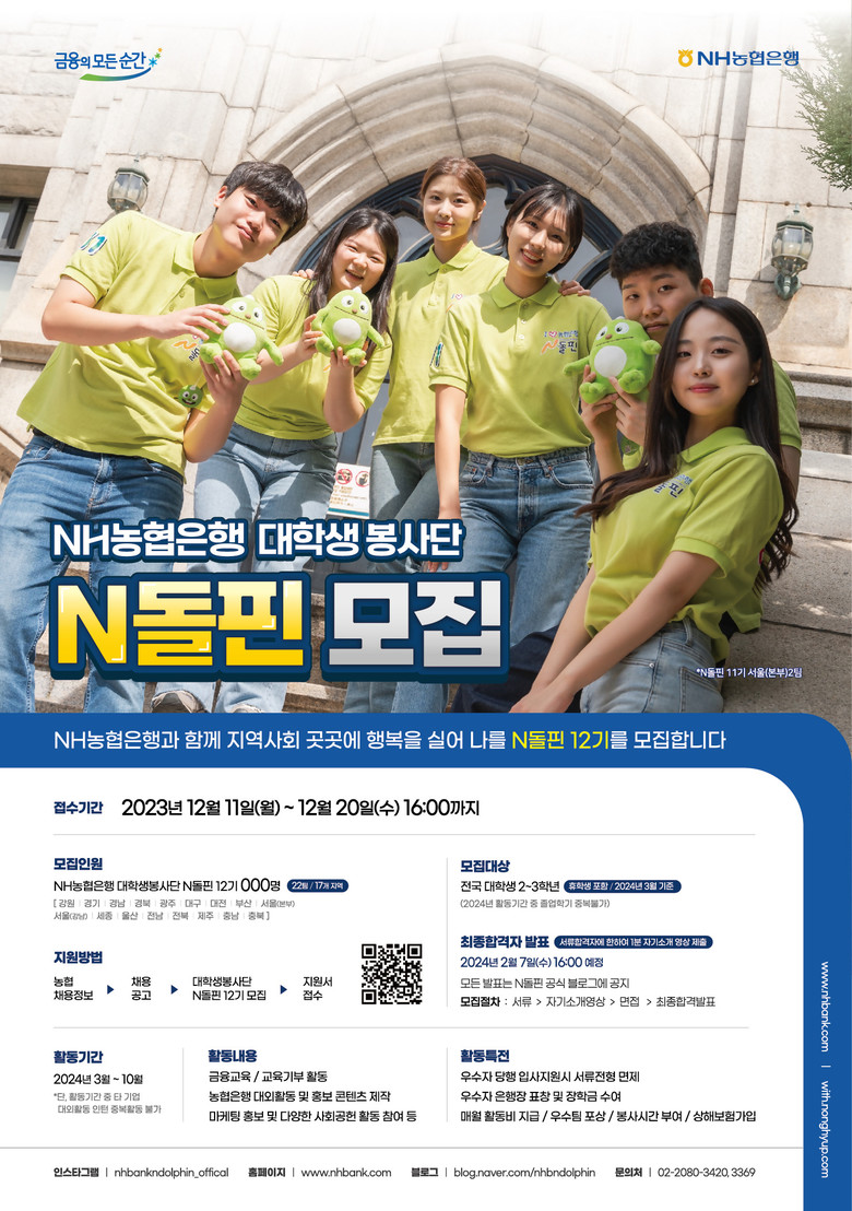 N돌핀 12기는 2024년 3월부터 청소년 금융교육, 청소년 진로멘토링 교육, 농촌봉사활동 등 다양한 사회공헌활동과 함께 당행의 브랜드 이미지 홍보, SNS채널 운영 등 MZ세대와의 원활한 소통 역할을 담당할 예정이다.