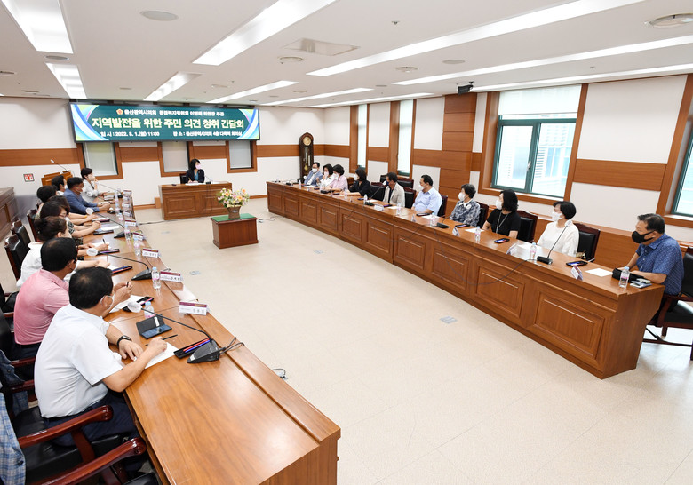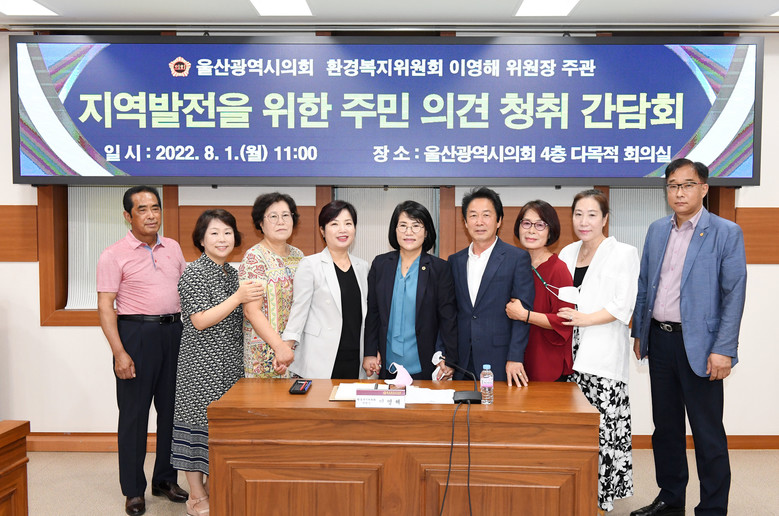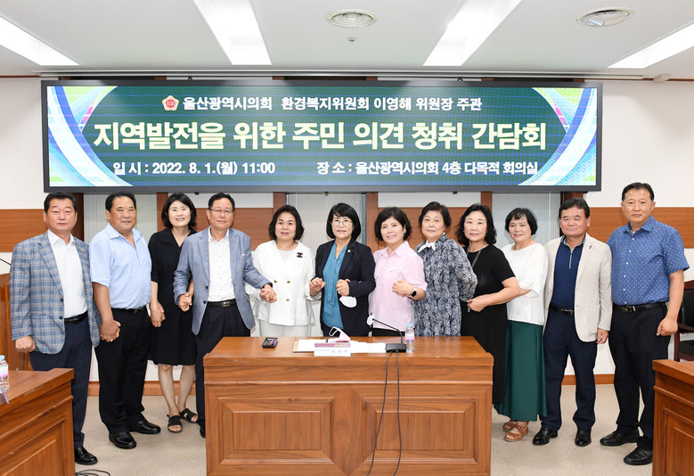 [울산 세계타임즈=이호근 기자] 울산시의회 이영해 환경복지위원장은 8월 1일 오전 11시, 시의회 4층 다목적회의실에서 대현동, 선암동 주민들과 ‘지역발전을 위한 주민 의견 청취 간담회’를 가졌다.