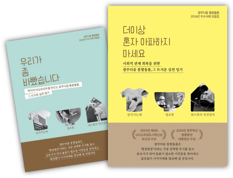 광주광역시(시장 강기정)는 ‘광주다움 통합돌봄’을 실행한 공무원과 돌봄 서비스 종사자 등의 현장목소리를 담은 두 번째 사례집 ‘더 이상 혼자 아파하지 마세요’를 최근 발간했다. 이 사례집은 2024년 통합돌봄 활동 사례집으로, 지난해 사례집 ‘우리가 좀 바빴습니다’에 이은 두 번째 발간이다.