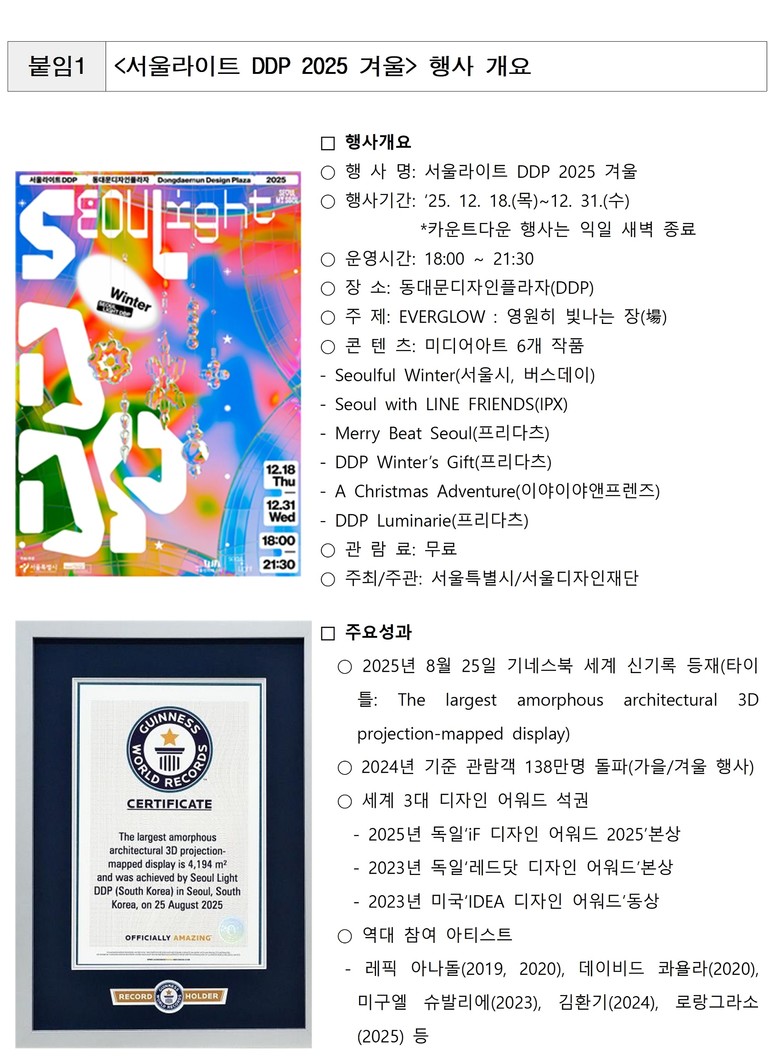 글로벌 미디어아트 축제 ‘서울라이트 DDP’는 2019년 첫 개최 이후 꾸준한 예술적·기술적 진화를 이어오며, 올해 세계 3대 디자인 어워드(iF, Red Dot, IDEA) 석권과 기네스 세계 기록 등재(타이틀: 세계 최대 비정형 건축물 3D 맵핑 디스플레이)라는 쾌거를 이루었다.