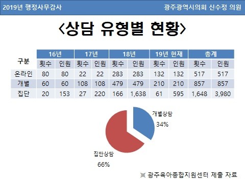 2019년 10월 말 기준, 상담건수는 매년 증가하는데, 보육교사는 7,538명 대비 상담전문요원은 고작 1명이다. 4년 동안 7,538명의 보육교직원 중, 1,374명 34.5%만이 상담 서비스를 받아본 것으로 나타났다.
