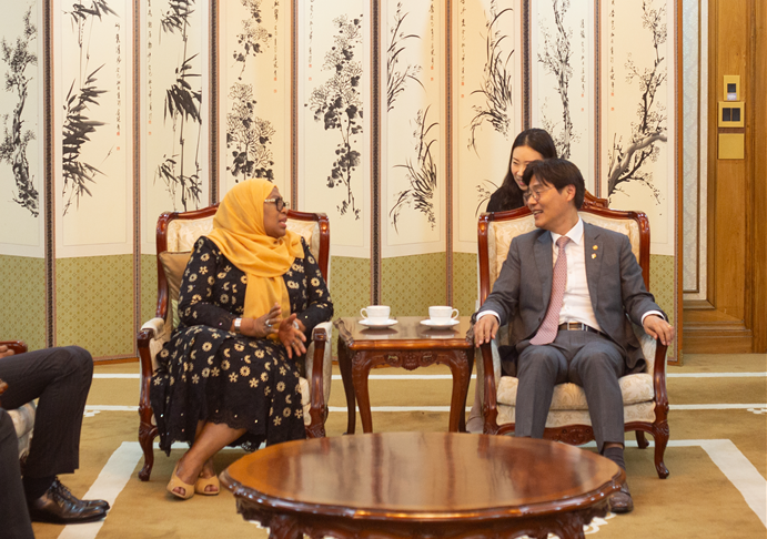 2024년 5월 31일 김형렬 행복청장(오른쪽)과 탄자니아 술루후 대통령(왼쪽)과 회담을 나누고 있다.