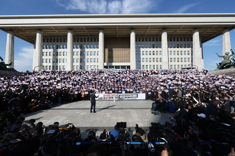 [세계타임즈 = 심귀영 기자] 4일 서울 여의도 국회 본청 앞 계단에서 열린 '윤석열 '에서 더불어민주당 이재명 대표, 조국혁신당 조국 대표를 비롯한 야당 의원과 참가 시민들이 구호를 외치고 있다. 2024.12.4